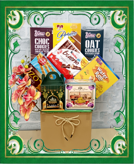 Gifts & Raya Goodies presented in a Basket with Raya Decoration.