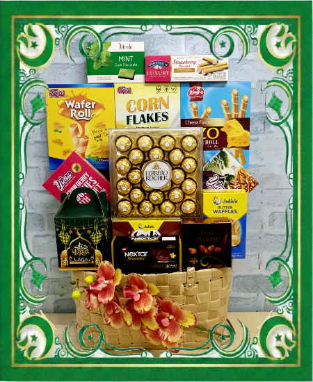 Gifts & Raya Goodies presented in a Basket dressed with Raya Decoration.